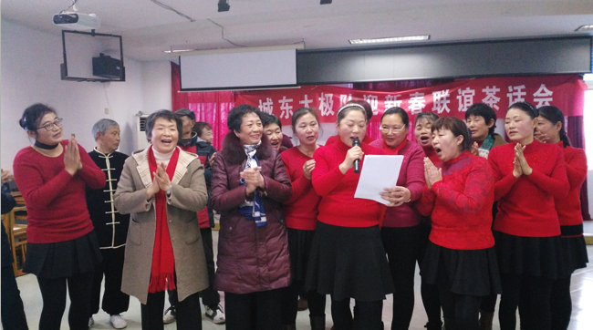 窗外寒風(fēng)瑟瑟,室內(nèi)歡聲笑語(yǔ)春意濃濃。兩個(gè)小時(shí)的演出在《難忘今宵》的合唱中結(jié)束。聯(lián)誼會(huì)的成功舉辦,展現(xiàn)出當(dāng)代中老人追求積極向上、樂(lè)觀生活,更是當(dāng)今幸福生活、和諧社會(huì)的一個(gè)縮影。圖為淮海城東太極隊(duì)聯(lián)誼茶話會(huì)活動(dòng)的場(chǎng)面。