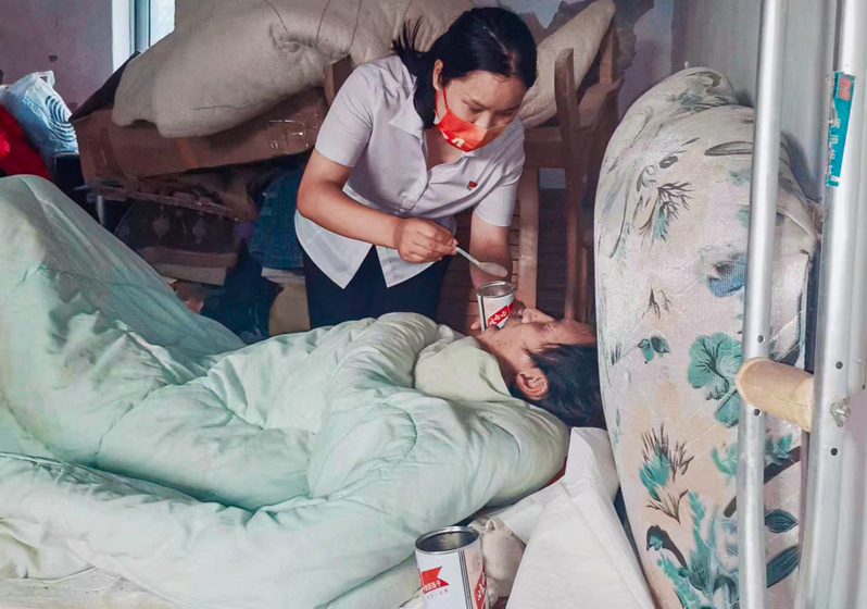 云臺農場張圩居委會所轄小糧地居民點,地理位置偏僻,是個只有5 戶人家的待撤并村莊。2022年8月9日,在“四個百”活動日常走訪中,當居委會走訪到小糧地居民點曹子牛家時,發現昏暗的房間內陣陣異味撲鼻而來。獨居在此的居民曹子牛,因起夜從床上不慎跌落在地,造成意識模糊講不出話來,大小便失禁,生活無法自理,成了一名“失能人”。作為居委會的幫扶對象,曹子牛一直是村子里讓人頭疼的“老大難”。年輕時候的曹子牛常年游手好閑、酗酒成性,喝多了就家暴妻子孩子,2010年、2018年,他先后兩次因為酒駕摔傷,導致左腿粉碎性骨折、腰部受傷,妻子頭部嚴重受傷。厄運接踵而至,讓妻兒無法忍耐,先后離開了家。由于他平日的言行,加之親屬能力有限無人愿意照料他,這給張圩居委會黨支部書記徐洪敏出了一道大難題,這燙手的山芋到手了就沒有丟掉的道理,徐書記沒有絲毫的猶豫,她立即成立了以她和居委會黨支部委員段萬江同志、小糧地轄區網格單元長顧林國同志為成員的專項幫扶小組,第一時間為曹子牛送去了米、面、水、雞蛋、八寶粥、隔尿墊、尿不濕等食物和生活必需品,并看守照料曹子牛。照料這樣的失能人難度可想而知,而這位90后女書記愿意帶著大家干這種又臟又累伺候人的活,更是難以想象!面對滿屋的異味,她連眉也沒皺一下,不嫌臟、不怕累,帶領幫扶小組上前給曹子牛喂水、喂藥、喂飯,處理他的大小便,換洗床鋪,打掃房間,真正將群眾視為自己的親人去照料,去愛護。照料曹子牛生活的同時,她也沒有停止為曹子牛爭取援助的腳步。她積極聯合轄區派出所和有關部門,想方設法聯系他的親屬,苦口婆心的勸說,幫助協調矛盾糾紛,積極申請民政救助,聯系海州區殘聯上門幫助他評殘,為曹子牛申請重殘補助,讓曹子牛真真切切地感受到黨的關懷。