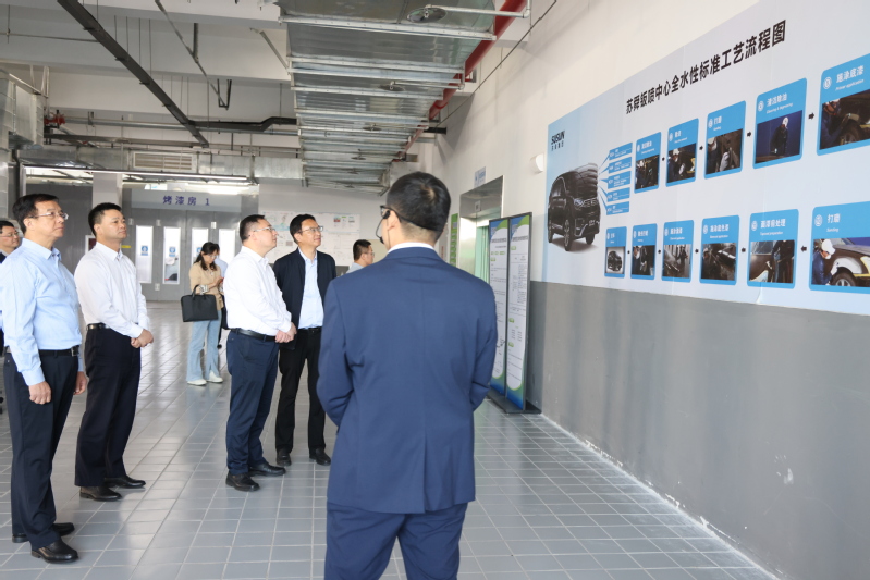 在蘇舜公司鈑噴中心“綠島”項目現場,督察組詳細了解了全水性標準工藝噴涂流程、傳統溶劑性油性漆與水性漆環保的參數對比。在中涂預噴綜合房、水性漆環保型烤漆房、全水性油漆調漆間、VOCs凈化治理裝置及全封閉漆后處理工位等點位,督察組聽取了設備運行情況介紹,詢問了廢棄材料回收處置情況。督察組還聽取了蘇舜公司生態環保工作和鈑噴中心“綠島”項目建設情況的匯報,詢問了園區雨水回收綜合利用系統使用情況。