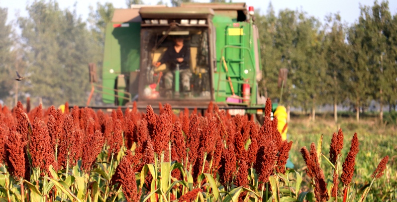 火紅,也是豐收的顏色。在外拓基地,8400畝酒用高粱進入全面收割階段,一輛輛高粱收割一體機轟鳴著來回穿梭,一株株穗大粒密的高粱被收割機納入后吐出,粉碎后的秸稈撒在地里,留下粒粒飽滿的果實,形成了一幅美麗的豐收畫卷。