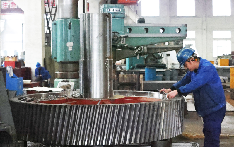 在金象傳動車間內,鉆工正全神貫注地檢測齒輪加工精度,確保每一個參數都達到高標準。他們對每一個環節的嚴格把控都凝聚著對品質的追求,他們用精湛技藝和敬業精神,為機械傳動設備的高質量生產保駕護航。