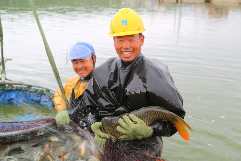 正值淡水魚出塘上市季節,江蘇省連云港市海州區江蘇農墾崗埠農場南漁場,大型吊車正在起網捕撈鯉魚,一幅人歡魚躍的水上夏收景象。圖為漁民在展示捕撈的大鯉魚。 徐衛 攝(來源:大國三農)