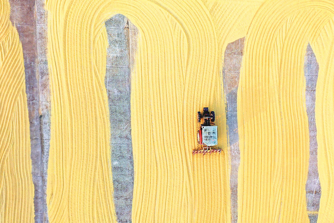 10月27日,連云港市海州區(qū)的江蘇農(nóng)墾崗埠農(nóng)場,職工駕駛糧食翻曬機械在場上來回穿梭,翻曬剛剛收獲的水稻。 陶桂軍 嚴連鳳 攝(視覺江蘇網(wǎng)供圖)