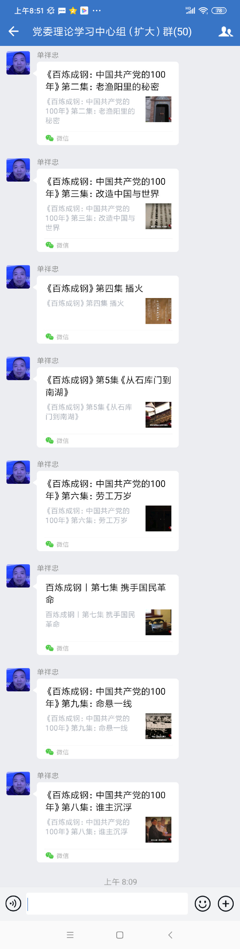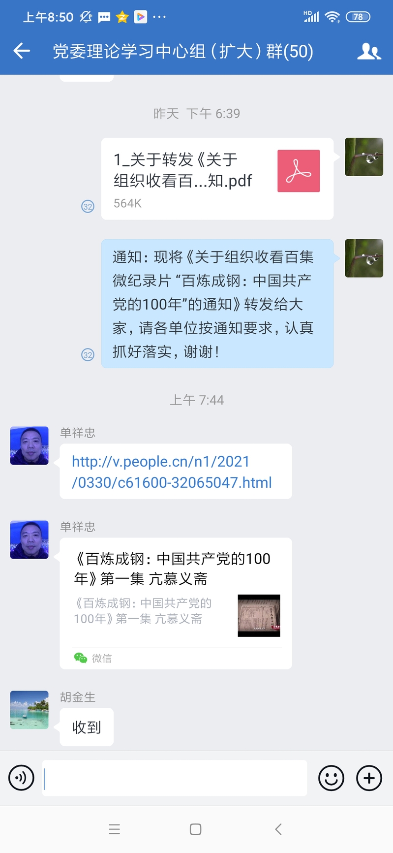 淮海農場公司在昨天傍晚接到江蘇農墾黨史學習教育第三組《關于組織收看百集微紀錄片百煉成鋼:中國共產黨的100年”的通知》后,立刻借助企業微信平臺黨委理論學習中心組(擴大)群進行轉發落實,農場黨委書記單祥忠在今天上午便將搜集來的《百煉成鋼:中國共產黨的100年》的紀錄片第1至第9集的視頻發布的學習群中,并以此來進一步激發起廣大黨員干部職工學習黨史的熱情,在方便大家觀看學習中,不斷提升黨史的學習教育成效。