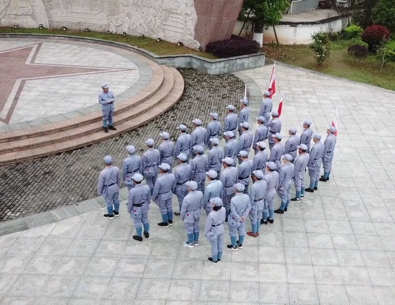 在毛澤東書寫的星星之火可以燎原大型浮雕前,孫國(guó)祥帶領(lǐng)大家一起高唱國(guó)歌,并在音樂聲中,向班級(jí)軍旗手及四個(gè)縱隊(duì)軍旗手進(jìn)行了授旗儀式。