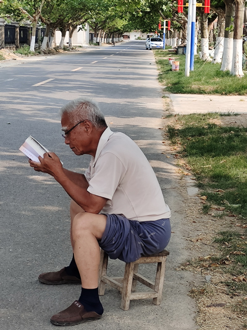 農(nóng)場公司黨委先行從抓好在職黨員學(xué)習(xí)閱讀“四本指定用書”開始,讓大家讀原著,學(xué)原文,悟原理。在反復(fù)閱讀這部重要著作中,不斷增進(jìn)感情,強(qiáng)化閱讀自覺性主動性,從而發(fā)自內(nèi)心深處地去鉆研之,從而形成心靈的認(rèn)同。繼而將學(xué)習(xí)“四本指定學(xué)習(xí)用書”覆蓋到全體離退休老黨員中。農(nóng)場的老黨員不僅是淮海開荒建場功臣,是農(nóng)場的寶貴財富,也是農(nóng)場實(shí)施高質(zhì)量發(fā)展提質(zhì)增效的重要資源,更是推動農(nóng)場公司黨史學(xué)習(xí)教育活動扎實(shí)有效開展的重要力量。考慮到老黨員們年事已高,集中學(xué)習(xí)不便,為確保黨史學(xué)習(xí)教育的全覆蓋,不缺課,不掉隊,農(nóng)場公司黨委結(jié)合實(shí)際情況,以各基層黨支部為單位,為離退休黨員開展“送學(xué)上門”活動。將黨史“四本指定學(xué)習(xí)書籍”送到每一位離退休老同志們的家中,鼓勵他們繼續(xù)發(fā)揮黨員的先鋒模范作用,為農(nóng)場的發(fā)展貢獻(xiàn)自己的力量和智慧。讓老黨員們足不出戶就能了解到黨史學(xué)習(xí)教育新思想新的要求,同時也讓他們感受到了來自組織的關(guān)懷和溫暖。圖為老黨員王老在路邊蔭涼下學(xué)黨史時的鏡頭。