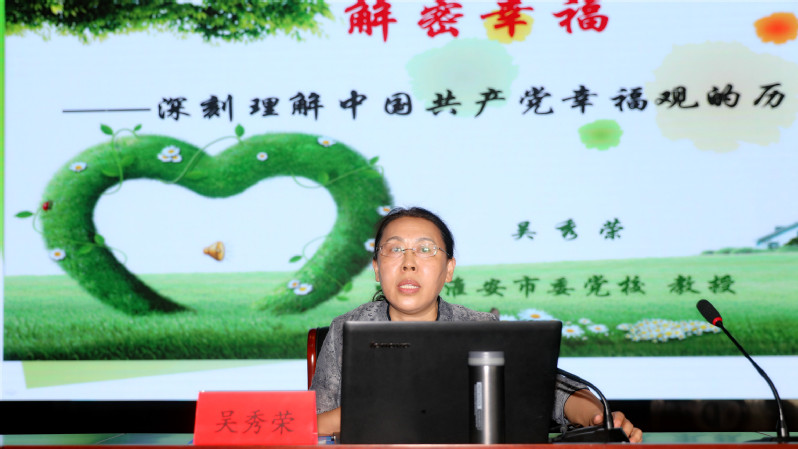 淮安市委黨校副教育長、教授吳秀榮應邀到場為廣大黨員職工作《解密幸福--深刻理解中國共產黨幸福觀的歷史演進》專題宣講。“我們黨的百年歷史,就是一部踐行黨的初心使命的歷史,就是一部黨與人民心連心、同呼吸、共命運的歷史。”宣講以習近平總書記講話為開篇,依次從幸福的本質、中國共產黨幸福觀歷史演進、中國共產黨的成功原因剖析三個方面逐層推進,著重從物質生活和精神生活相統一、享受相統一、個人幸福和集體幸福的統一分析了中國共產黨幸福觀歷史演進,剖析了中國共產黨成功的原因,宣講還從四個方面詳細闡述了習近平的幸福觀:傳承和發展了馬克思主義幸福觀、創新和超越了中國傳統幸福觀、激蕩了個人層面的奮斗精神、彰顯了領導層面的擔當氣派。宣講最后以“幸福,不僅僅是名詞;幸福,更是動詞﹍﹍”為結尾,給人啟迪,發人深思。