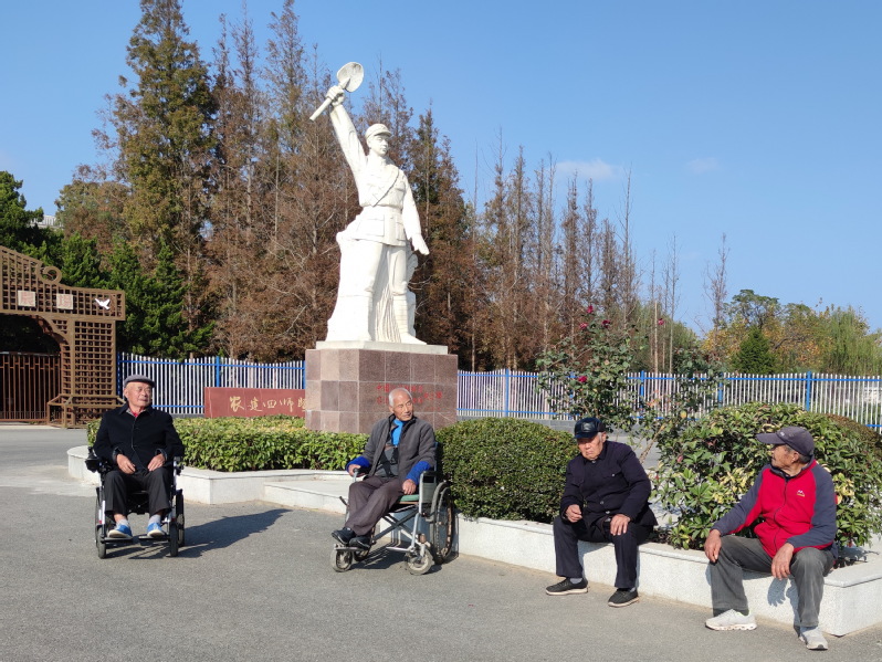 不斷前行的淮海人,扎實開展黨史學習教育,大力弘揚軍墾精神,積極宣傳農建四師先進模范,用榜樣的力量感召人、鼓舞人、塑造人。農場黨委開展“一個黨員就是一面旗幟”“黨員與職工結對”“黨員責任區”活動,并結合黨務公開試點工作和創先爭優,創建學習型、服務型、創新型黨組織等活動,加強農場黨建工作。黨史學習教育開展以來,淮海農場充分利用農建四師陳列館這一紅色實境教育基地和健在老軍墾“活化石”的功能,讓軍墾傳統不斷發揚光大。長長的黨史學習教育清單中,農場黨委除常規固定動作外,還在黨員干部和青年員工中采取征集黨史知識試題,開展黨史知識競賽、征文等形式,將系列活動與黨史學習教育深度融合,并切實解決職工居民的所需、所急、所難,以更好地把廣大職工居民緊密團結在黨的周圍,為企業改革發展貢獻力量。圖為農場老軍工在為學生說傳統和健在的老軍墾坐在雕像前回憶曾經的風花雪月。